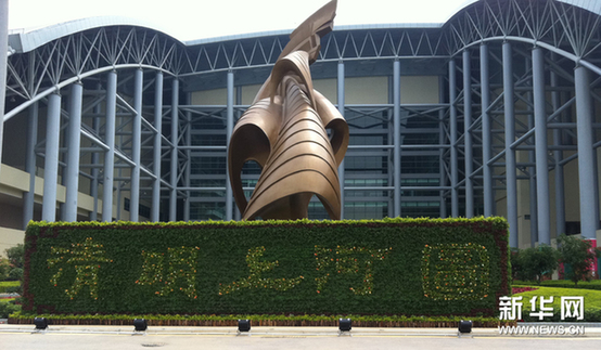 图为展场澳门东亚运动会体育馆前植物构筑的“清明上河图”字样