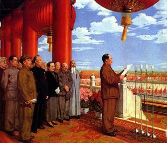 靠南的一幅,是1972年在董希文的指导下,靳尚谊、赵域复制的《开国大典》。1979年,为纠正“文革”中“左”的错误,革博征得上级同意,决定将《开国大典》恢复原貌。根据原作家属的意见,为保留原稿,委托靳尚谊在复制品上修改,后靳尚谊因故未能修改,而推荐阎振铎、叶武林完成了修改,在复制品上恢复了刘少奇和高岗,此后在所有重大展览中的作品均为这幅复制品,画中第一排中的领导人均为国家副主席,左起为朱德、刘少奇、宋庆龄、李济深、张澜和高岗。