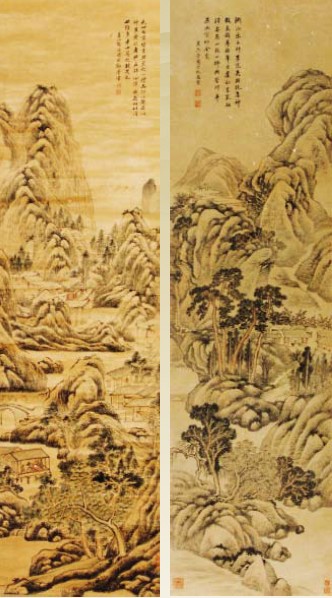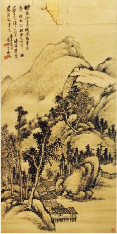 《高山溪水村屋图》纵166厘米,宽46厘米。永瑢(1743-1790年),号九思主人,清高宗弘历第六子,封质庄亲王。书法得徐浩笔意,画 花卉古淡苍逸,兼有少谷、沱江之胜,山水画学习古人笔意,但其气息皆欠超妙,卒年47岁。著作有《九思堂诗钞》。《高山溪水村屋图》设色,纸本。主峰耸 立,层峦叠嶂,山势由远及近,由高而低,起伏变化无穷,大小山岗密林丛生,浓荫蔽日。右上部的主峰危崖切入画面,左侧有一崎岖的山路通向坡顶,上有一草 亭,空无一人,若站在里面,凭栏远眺,整个山川一览无余;侧下的悬崖间一股飞泉飞泻而下,汇入山腰的水潭,潭水盈满,四处横溢,向下而流山脚,锐势顿减, 变成淳淳流水。主峰另一侧的山间泉水,顺山坡直流而下,到山腰拐弯向山脚而流,河旁有一院落,村屋数间,屋内设置桌凳,然空无一人。而山石峰峦,大小相 间,拔地而起,大岩块、小矾石、宽高坡、陡悬崖、曲折山路纵横有序,错综有姿,显出了高山深远的雄秀丽姿。画中一簇簇树木设青绿色,松木各异,姿态不同, 或冲天挺立,或绿荫繁茂,或倾欹虬曲,加上石间小草,给高山峻岭披上绿装,增加苍郁沉着气势,臻于引人入胜的境地。左上角有作者的长题:“浙派亦云师李 (李成)范(范宽)矣,然绝无神致,气韵专秀,笔力苍劲,墨气融洽,要无一点一拂与营邱(李成)华原(范宽)两家吻合处。皇六子写于九思堂”,两方“皇六 子”、“九思主人”下钤印。关于李成与范宽,均属两宋名画家,此画长题内容是评价山水画的。