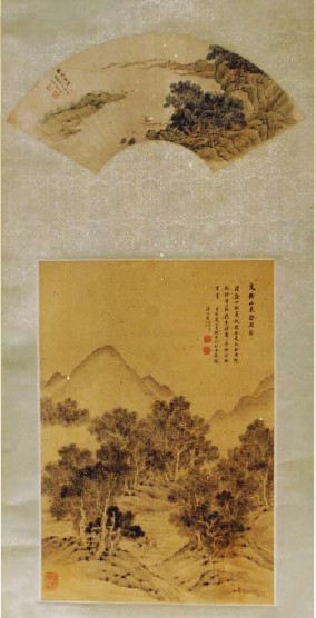 该条幅有绘画两件:其中扇面宽24厘米、长54厘米,《松岗远岫》扇面与《文衡崃禽囿图》条幅裱在同一条幅中。