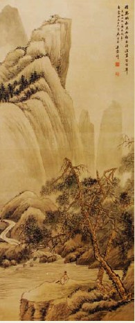从此图看,是以清初“正宗”画家“四王”为法,倾力于王原祁,有立体效果,而又有力、韧、畅、洗炼、真实,皴擦有章法,在有意与无意之间。其间 情趣达到淋漓尽致的地步,在表现技巧上也很得法,墨色在浓墨中衬托以清淡,清淡中突出焦笔,把山间复杂的山光水色烘托出来。最高的峻岭山峦与右下面的溪流 水潭,采用“无墨求染”。峻岭仅用淡笔,岭高云淡,皴点山腰,山顶与山间没有施墨,却给人以云雾环绕之感;水潭无墨,却是水深清净,潺潺而流。此画以无墨 表现了无形的流云与无形的流水,生动而真实。